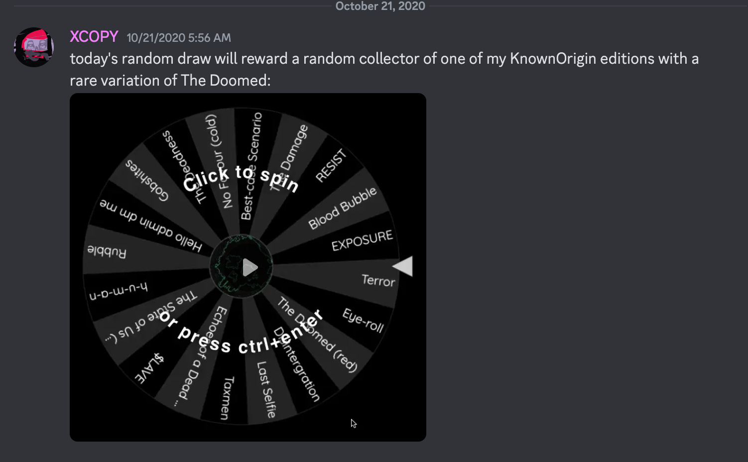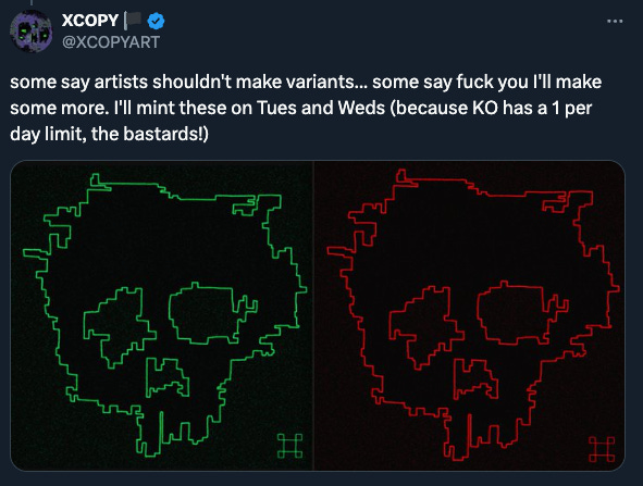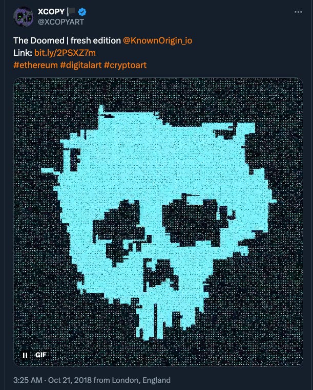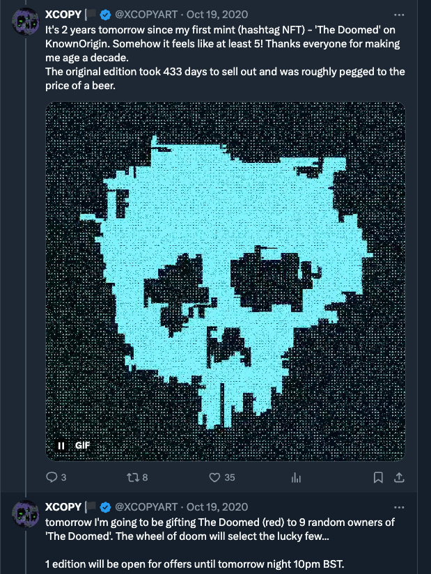 In the XCOPY tradition, many of these editions were given away via raffle, this time to holders of the original Doomed, holders of other XCOPY pieces on the Known Origin contract, and even to holders of the $DOOM token. Here’s one of XCOPY’s tweets about it at the time.
